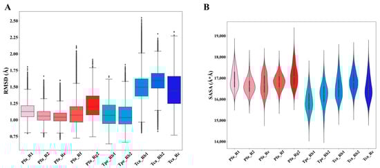The trajectory was analyzed by Amber’s tool ‘cpptraj’ and the Prody package [30]. All results were presented using custom Python scripts based on the matplotlib [31] and seaborn (https://seaborn.pydata.org, accessed on 1 February 2024) libraries. The solvent-accessible surface area (SASA) was computed using cpptraj’s ‘surf’ command. RMSD (root-mean-square deviation) and RMSF (root-mean-square fluctuation) values were conducted utilizing the ‘rmsd’ and ‘atomicfluct’ commands in ‘cpptraj’, respectively. Before RMSD and RMSF calculation, all trajectories were aligned to their respective initial structure to reduce the impact of overall translation and rotation. Only Cα atoms were involved in computing RMSD and RMSF.