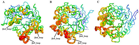 Conformational dynamics of ginsenoside hydrolases, Pfu (A), Tpe (B), and Tca (C). 3D backbone representation structures mapped with per-residue average backbone RMSF (root-mean-square fluctuation) values. The backbone color ranges from red to blue corresponding to line thickness, and denotes backbone RMSF values varying from lowest to highest.