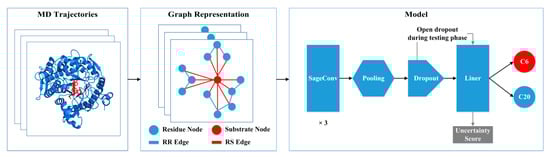 The overall architecture of the proposed workflow. Each frame in the molecular dynamic (MD) trajectory is represented as a heterogeneous graph, which contains residue and substrate nodes and their residue–residue (RR) and residue–substrate (RS) edges. The model consists of 3 SageConv layers, a pooling layer, a dropout operation, and a linear mapping.