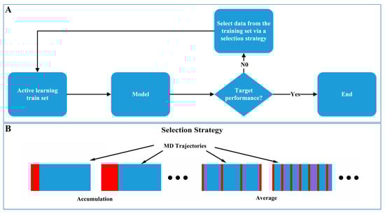 Active learning from molecular dynamics. (A) Active learning model training process. (B) Active learning training data selection strategy.