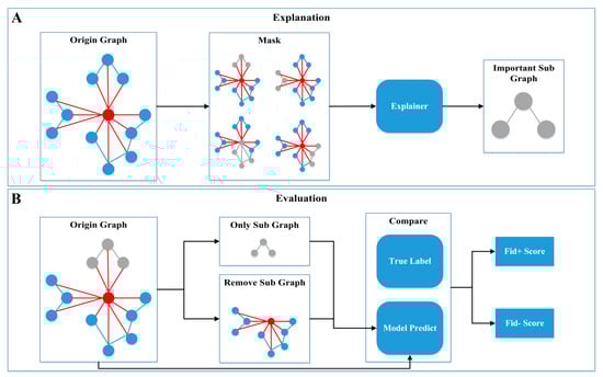 A mask strategy was used to filter out the subgraphs that have the greatest impact on model performance [37]. The Captum algorithm that supports heterogeneous graphs was employed to extract model interpretability [38]. The fidelity score was selected as an evaluation indicator for the reliability of interpretability. The subgraph’s contribution to the prediction was evaluated by comparing fidelity scores before (fid+) and after (fid−) removing the important subgraph. Here, fid+ represents necessity. If removing the subgraph from the initial graph changes the model’s prediction, it also indicates the subgraph’s importance. Fid- represents sufficiency. If the presence of a subgraph alone leads to the model’s initial prediction, it indicates the subgraph’s importance. The specific formulas are as follows: