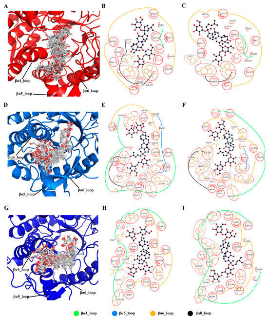 Similar to Pfu, the conformational fluctuations of the substrates in Tpe (Figure 9D) and Tca (Figure 9G) were large when they interacted with βα4_loop, βα5_loop, and βα6_loop. In the binding modes of Tpe (Figure 9E,F) and Tca (Figure 9H,I), both of them mainly established strong connections with βα4_loop and βα6_loop. The key residues identified by the model interpretability are mainly distributed in βα4_loop and βα6_loop, implying their strong relationship to the regioselectivity of GHs.