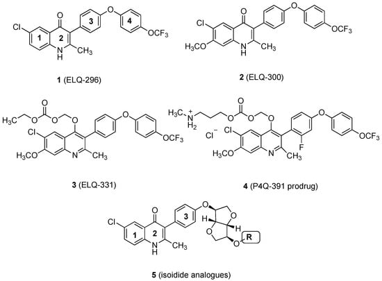 Research efforts to improve the bioavailability of ELQs were largely centered on the preparation of prodrug derivatives of ELQs, such as the O-(ethoxycarboxymethyl derivative, 3 [5], and the methylaminopropoxycarboxymethyl derivative, 4 [6]. Such prodrugs have limitations, however, in that their cleavage characteristics may differ as a function of species, tissue distribution, and local enzymatic or pH environments [7,8,9,10,11]. Adjustment of the drug-likeness properties of the active compound itself offers the potential advantage that its behavior in biological systems is more easily defined and evaluated.