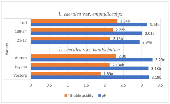 Average pH and total acidity (g·100 g−1) of L. kamtschatica and L. emphyllocalyx fruits depending on year of harvest. Data are expressed as mean values (n = 3) ± SD; SD: standard deviation. Mean values with different letters are significantly different (p < 0.05).