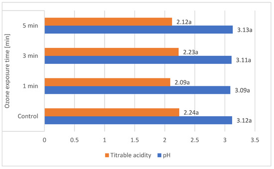 The total acidity (as citric acid) and the pH of the L. kamtschatica and L. emphyllocalyx fruits were analysed through the potentiometric titration of the sample for analysis with a standard 0.1 M NaOH solution at pH = 8.1 using TitroLine 5000 (SI Analytics, Weiheim, Germany) according to the method given in PN-EN 12147:2000 [42]. The results are expressed as g of citric acid per 100 g of fruit. Each fruit was analysed 24 h after ozonation. The analyses were performed in triplicate.