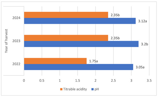 There were significant differences in the fruit harvest date; berries of both botanical varieties harvested in 2023 were characterised by an average pH that was 5% higher compared to other years [Figure 3].