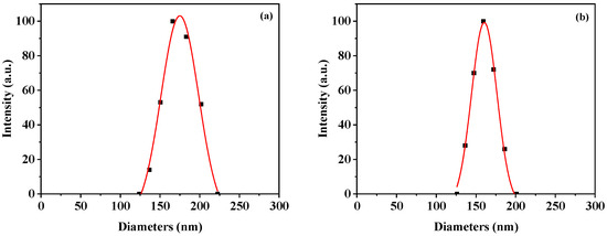 Typical hydrodynamic diameter and distribution of the DDOXketal-NPs1 nanoparticles (a) and the DDOXketal-NPs2 nanoparticles (b).