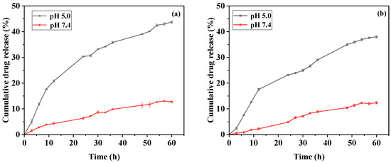 Acid-triggered drug release from the DDOXketal-NPs1 nanoparticles (a) and the DDOXketal-NPs2 nanoparticles (b) in releasing media with different pH values.