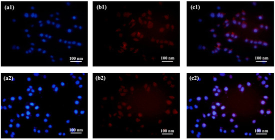 CLSM images of the HepG2 cells after incubation with the DDOXketal-NPs1 nanoparticles (1) and the DDOXketal-NPs2 nanoparticles (2) at a dose of 15 μg/mL for 48 h: DAPI (a), DOX (b), and merged (c).