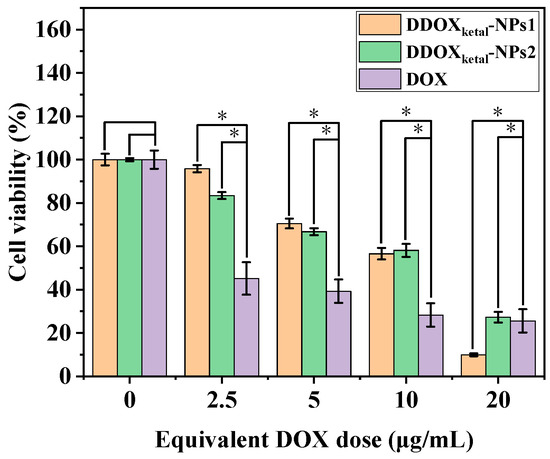 In vitro cytotoxicity of the free DOX and DDOXketal nanoparticles on HepG2 cells after incubation for 48 h. The data are given as the mean ± S.D. (n = 3) (* denotes significant difference p < 0.05).