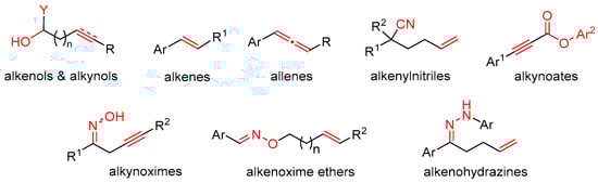 Some popular substrates for trifunctionalization, including alkenols/alkynols, alkenes/allenes, alkenylnitriles, and alkynoates, are shown in Figure 1.