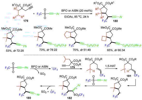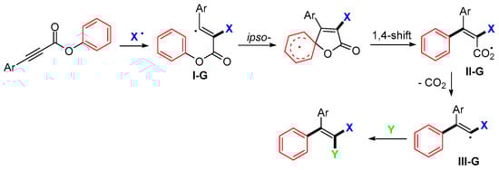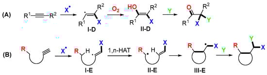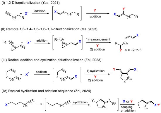 Alkynol-based radical reactions are presented in this section. The addition of a radical to the double bond of alkenols generates alkyl radical intermediates, while the addition of a radical to the triple bond of alkynols generates more reactive vinyl radical intermediates, which could be more favorable for FGM as well as HAT in the trifunctionalization reactions.