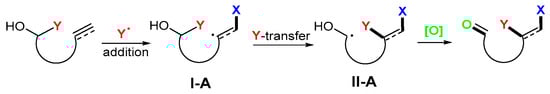 Trifunctionalization of alkenols and alkynols are Type-I reactions shown in Scheme 3. They involve the addition of radical Y to form radicals I-A, followed by Y group migration to give radicals II-A, and the oxidation of OH to the carbonyl group (Scheme 3). In the reaction process, the key step is the Y group transfer. The Y group could be aryl, alkynyl, -CN, -CHO, phosphinoyl (-POR2), and sulfonyl (-SO2R) groups. It is noteworthy that functional group migration (FGM) could be a rearrangement process involving radical cyclization and cleavage. In the case of aryl migration, it is an ipso-cyclization/cleavage reaction process.