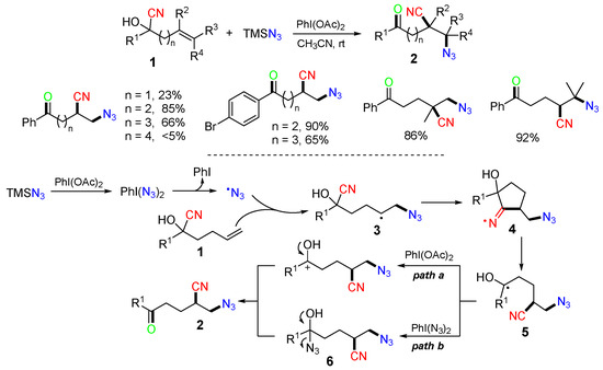 The mechanism proposed in Scheme 4 suggested that the azido radical generated from the interaction of trimethylsilyl azide (TMSN3) with PhI(OAc)2 adds to the C=C bond of alkenyl cyanohydrins 1 to afford alkyl radicals 3, which then shifts the CN group through cyclic iminyl radicals 4 to form radicals 5. There could be two ways to convert radicals 5 to products 2: via oxidation with PhI(OAc)2 or through the formation of azidohydrins 6.
