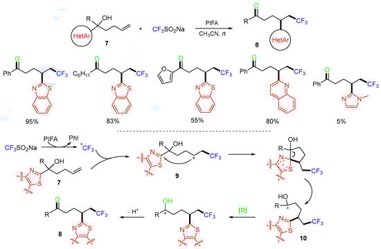 The Zhu group reported a method for distal heteroaryl shift in 2017 (Scheme 5) [39]. This method is good for 1,4-aryl shift since the migration via 5-membered ipso-radical intermediates is more favorable than other ring sizes. In the reaction process, a CF3 radical generated from the Langlois’ reagent (CF3SO2Na) and phenyliodine bis(trifluoroacetate) (PIFA) add to the C=C bond of hydroxy-substituted alkenes 7 to give alkyl radical intermediates 9, which then undergo 1,4-shift of the aryl group to form more stable hydroxyalkyl radicals 10, followed by oxidization to give products 8.
