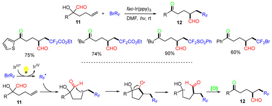 The Zhu group extended the reaction scope for carbonyl migration (Scheme 6) [40]. The photoredox reaction of α-formyl-substituted alkenols 11 with fluoroalkyl bromides afforded formyl-migrated trifunctional products 12.