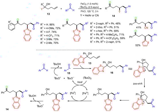 A FeII-catalyzed reaction of alkenols 13 involving heteroaryl group shift to give 1,6- and 1,7-diketons 14 was reported by the Li group in 2020 (Scheme 7) [41]. The proposed mechanism suggested that the tBuO radical generated from di-tert-butyl peroxide (DTBP) in the presence of FeII abstracts hydrogen from aldehydes to afford acyl radicals 15. The addition of acyl radicals to the alkene moiety of alkenols 13 produces alkyl radicals 16, followed by intramolecular radical ipso-migration and FeIII-catalyzed oxidation to give products 14.