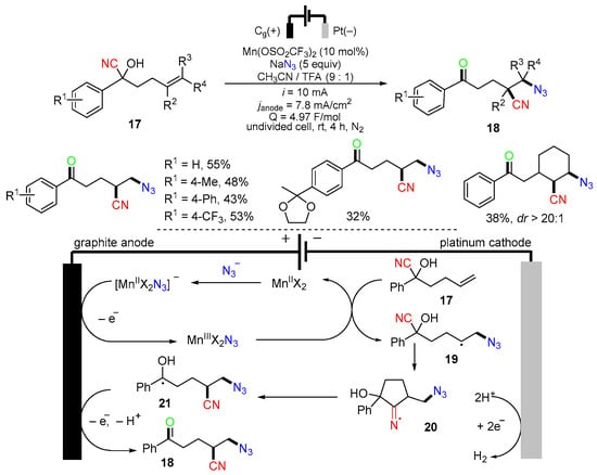 An electrochemical reaction of alkenyl cyanohydrins 17 for making azidocyanated products 18 was reported by the Morrill group in 2022 (Scheme 8) [42]. The proposed mechanism suggested that the [MnIIX2N3]− generated from the interaction of MnIIX2 with NaN3 is oxidized at the graphite anode to give MnIIIX2N3, which delivers the azido radicals. The addition of azido radicals to alkene 17 to give secondary alkyl radicals 19, followed by cyclization, affords cyclic iminyl radicals 20. β-Scission of radicals 20 gives α-hydroxy alkyl radicals 21, which are oxidized at the anode to give final products 18. Hydrogen gas evolves through proton reduction at the cathode.