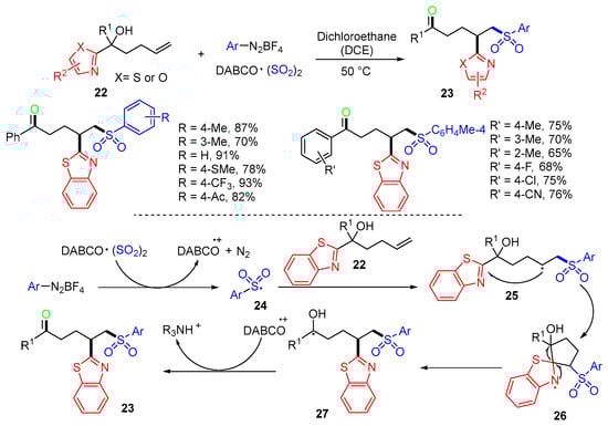 A three-component reaction of heteroaryl-substituted alkenols 22, aryldiazonium tetrafluoroborates, and 1,4-diazabicyclo [2.2.2]octane (DABCO)·(SO2)2 was reported by Wu’s group in 2021 [43]. Under catalyst-, base-, and additive-free conditions, the reaction gave products 23 in moderate to good yields (Scheme 9). The proposed mechanism suggested that sulfonyl radicals 24 generated from aryldiazonium tetrafluoroborate and DABCO·(SO2)2 undergo radical addition to alkenols 22 to afford carbon radicals 25, followed by cyclization to give the radicals 26. Ring-opening of radicals 26 forms more stabilized radicals 27, followed by oxidation to give products 23.