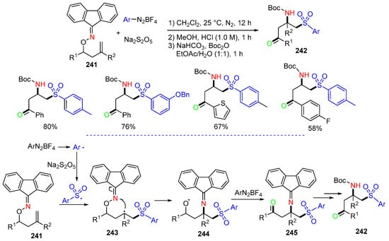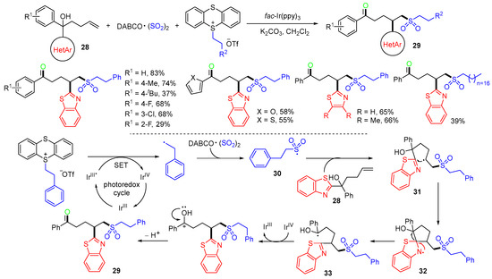 Very recently, the Guo group reported a photoredox reaction of alkenols 28, DABCO·(SO2)2, and thianthrenium salts for the synthesis of alkylsulfonylated ketones 29 (Scheme 10) [44]. In the reaction process, phenethyl radicals generated from the thianthrenium are captured by SO2 from DABCO·(SO2)2 to generate phenethylsulfonyl radicals 30. The addition of radicals 30 to the terminal C=C bond carbon of tertiary alcohol 28 affords intermediates 31, which go through a five-membered cyclic transition state to give spiro N-radical 32. The ring opening of unstable spiro structures 32 gives more stable hydroxyalkyl radicals 33, which are oxidized to give final products 29 after deprotonation.