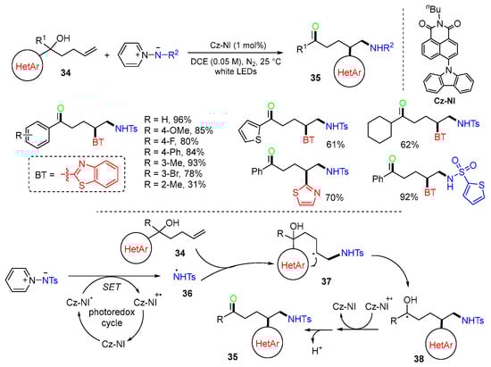 A photoredox reaction for the synthesis of amino ketones was reported by the Xu group in 2022 [45]. The Cz-NI-catalyzed reaction of alkenols 34 with N-protected 1-aminopyridinium under LED irradiation afforded distal amino ketones 35 in moderate to excellent yields (Scheme 11). In the reaction process, the N-centered radical 36 generated from the N-protected 1-aminopyridinium adds to the C=C bond of hydroxyl-substituted alkenes 34 to give alkyl radical intermediates 37, which then undergo 1,4-shift of the heretoaryl group to give more stable hydroxyalkyl radicals 38, followed by oxidization and deprotonation to give the final products 35.