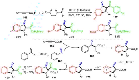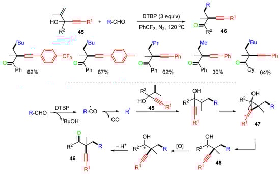 The reaction of 1,4-enyn-3-ols 45 with alkylaldehydes for the synthesis of α,β-functionalized ketones 46 was reported by the Xiang group in 2021 (Scheme 13) [47]. Alkyl radicals, generated from the decarbonylation of alkylaldehydes using DTBP as an oxidant, add to the C=C bond of 1,4-enyn-3-ols 45, followed by an alkynyl shift through the three-membered ring intermediates 47 to give radicals 48. Oxidation of 48 with DTBP and deprotonation give products 46. A similar reaction for the synthesis of α-alkynyl ketones was reported by the Tu group [48].