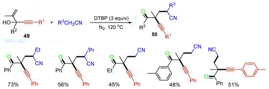 The reaction of 1,4-enyn-3-ols 49 with nitriles for the synthesis of cyanolated ketones 50 was reported by Cheng and coworkers in 2021 (Scheme 14) [49]. The alkyl radicals generated from the reaction of nitriles using DTBP as an oxidant afforded products 50 in moderate yields.