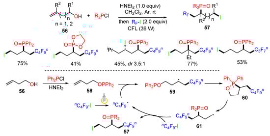 The Han group introduced a trifunctionalization reaction involving a phosphinoyl group shift in 2022 [53]. The reaction of homoallylic alcohols 56, R2PCl, and fluoroalkyl iodides (RF-I) under the irradiation of visible light afforded products 57 in good to excellent yields (Scheme 16). The proposed mechanism suggested that the nC4F9 radical generated from nC4F9-I adds to the C=C bond of 58 to afford alkyl radicals 59. Radical cyclization onto the phosphine affords cyclic phosphine radicals 60, followed by β-fragmentation of the C–O bond to form C-radicals 61, which are trapped by nC4F9-I through an iodine-atom transfer process to give products 57.