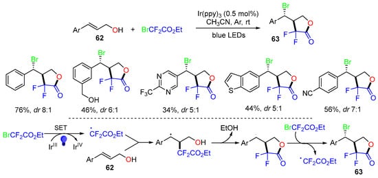In 2022, Molander and coworkers reported a photoredox reaction of cinnamyl alcohols 62 with ethyl bromodifluoroacetate under blue LED irradiation to give brominated α,α-difluoro-γ-lactones 63 in moderate to good yields in a diastereoselective manner (Scheme 17) [54]. In the reaction process, the CF2CO2Et radical generated from BrCF2CO2Et adds to the C=C bond of cinnamyl alcohols 62, followed by lactonization and the Br-atom transfer process to give products 63.