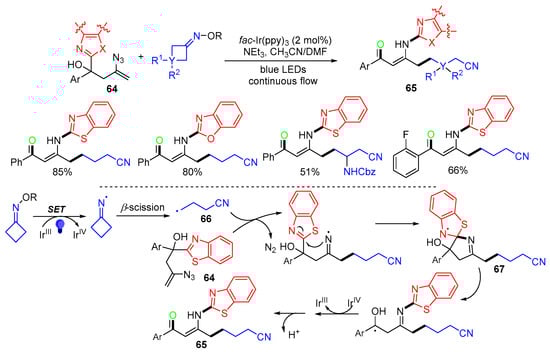 A photoredox reaction of heterocyclic-substituted azidyl homoallylic alcohols 64 with cycloketone oxime esters was reported by the Guo group in 2021 [55]. The reaction via 1,4-heteroaryl migration from the C-center to the N-center affords a variety of cyanoalkylacylated β-enamino ketone 65 in moderate-to-good yields under continuous-flow conditions (Scheme 18). The reaction process involves the addition of cyanoalkyl radical 66 to the C=C bond of homoallylic alcohols 64 with the loss of N2, followed by the C-center to the N-center heteroaryl migration through the key spiro radicals 67, single electron oxidation, and further deprotonation to give products 65.