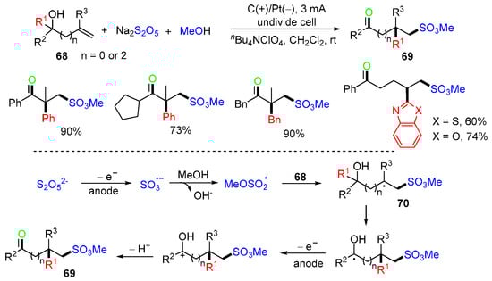 In 2022, the Ye group introduced an electrochemical reaction of alkenols 68 with Na2S2O5 and MeOH for the synthesis of ketosulfonate esters 69 (Scheme 19) [56]. The sulfite radical anion, generated from the anode oxidation of Na2S2O5, is trapped by MeOH to afford the methoxysulfonyl radical, which then adds to the C=C bond of alkenols 68 to yield radicals 70. Functional group migration (FGM), anodic SET oxidation, and deprotonation afford products 69.