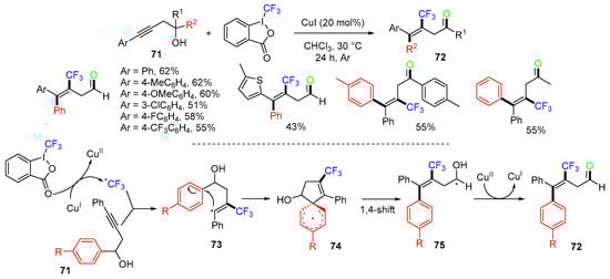 In 2014, Liang’s group reported a Cu-catalyzed reaction of homopropargylic alcohols 71 with Togni’s II reagent for the synthesis of CF3-containing 3-buten-1-one derivatives 72 (Scheme 20) [57]. The proposed mechanism suggested that the CF3 radical, generated from the reaction of Togni’s II reagent and CuI species, adds to the alkyne of homopropargylic alcohols 71 to give radicals 73, followed by 5-ipso cyclization to form radicals 74, and then radicals 75 for 1,4-aryl migration. Finally, single-electron oxidation of radical 75 with CuII species furnishes product 72 and a regenerated CuI catalyst.