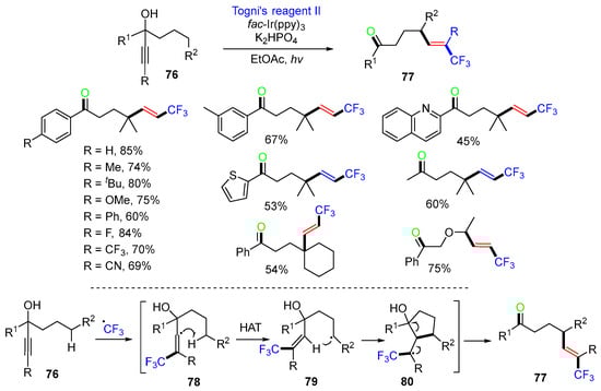 In 2019, the Zhu group reported a CF3 radical addition-initiated reaction of alkynols 76 for the synthesis of CF3-containing 5-hexen-1-ones 77 under mild photoredox reaction conditions (Scheme 21) [58]. The proposed mechanism suggested that the addition of CF3 radicals to alkynols 76 generates alkenyl radicals 78, which undergo 1,5-HAT to produce alkyl radicals 79. Cyclization of alkyl radicals 79 affords cyclopentanol intermediates 80, which undergo C–C bond cleavage to give stereoselective E-olefins 77.