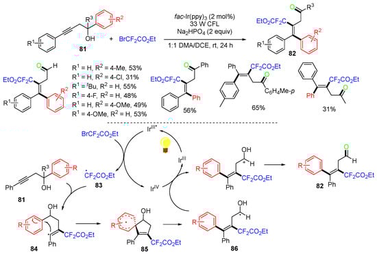 The Zhu group, in 2017, reported a carbodifluoroalkylation reaction of homopropargylic alcohols 81 under photoredox conditions (Scheme 22) [59]. In this reaction, BrCF2CO2Et is used as a source for difluorination. The proposed mechanism suggested that the active state IrIII* generated from photocatalyst fac-Ir(ppy)3 reacts with BrCF2CO2Et through a SET to give radical 83, which adds to the alkyne moiety of homopropargylic alcohols 81 to give radicals 84, followed by 5-ipso cyclization and cleavage of radicals 85 to give hydroxyalkyl radicals 86. SET oxidation and then deprotonation of radicals 86 give products 82.