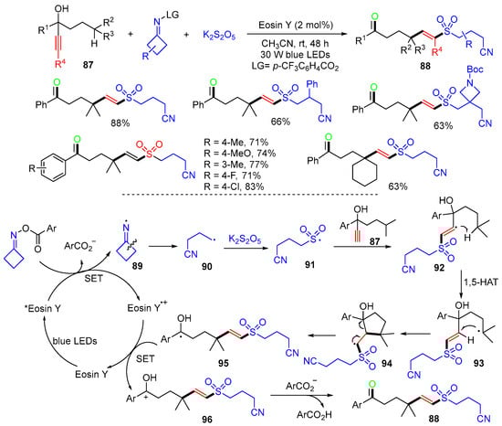 A photoredox reaction of propargyl alcohols 87, K2S2O5, and cycloketone oxime esters for the synthesis of cyanoalkylated vinyl sulfone 88 was reported by the Wu group in 2021 (Scheme 23) [60]. The initial step of the synthesis is the irradiation of Eosin Y under blue light to form excited Eosin Y*, which undergoes SET with cycloketone oxime ester to form iminyl radical 89 and then cyanoalkyl radical 90 after the C–C bond cleavage. The reaction of radical 90 with K2S2O5 leads to the formation of cyanoalkylsulfonyl radical 91, which adds to propargyl alcohols 87 to form radicals 92. 1,5-HAT of vinyl radicals 92 results in alkyl radicals 93, which undergo cyclization to give radicals 94. The C–C bond cleavage of 94 gives vinyl-migrated radicals 95, which undergo SET with Eosin Y•+ to give carbocations 96 and then products 88 after deprotonation.