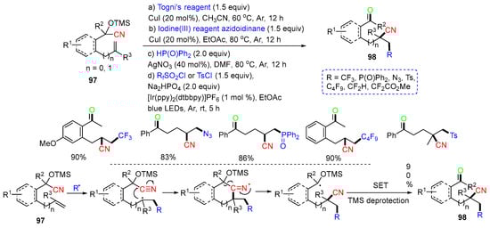 In 2016, the Liu group reported the CN migration reaction of TMS-protected alkenyl cyanohydrins 97. The reaction process involves the addition of R radicals (CF3, N3, P(O)Ph2, C4F9, and Ts radicals), remote CN group migration, and converting of OTMS to carbonyl group to afford cyano ketones 98 (Scheme 24) [61].