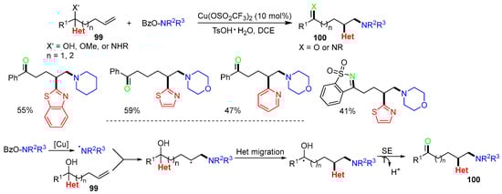 A Cu-catalyzed aminoheteroarylation of alcohol-, amino-, and ether-containing alkenes 99 was reported by the Liu group in 2021 [62]. The second functional group, X, was derived from X’ (OH, OMe, or NHR). The reaction process involves the addition of amino radicals generated from the BzONR2R3 to the C=C bond of alkene 99, followed by heteroaryl migration, SET, and deprotonation to afford the final product 100 (Scheme 25).