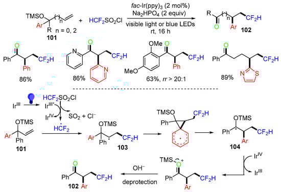 A photoredox-catalyzed reaction of α-aryl allyl alcohol TMS ethers 101 for the preparation of difluoromethyl-containing ketones 102 was reported by the Dolbier group in 2022 (Scheme 26) [63]. The proposed mechanism suggested that the CF2H radical derived from HCF2SO2Cl adds to the terminal carbon of alkenes 101 to form radical 103, followed by aryl ipso-migration to give radicals 104 and Ir-catalyzed oxidative SET to afford products 102 after deprotection. It is noteworthy that if there are two aryl groups that could undergo migration, the rr is used to indicate the selectivity of two aryl groups.