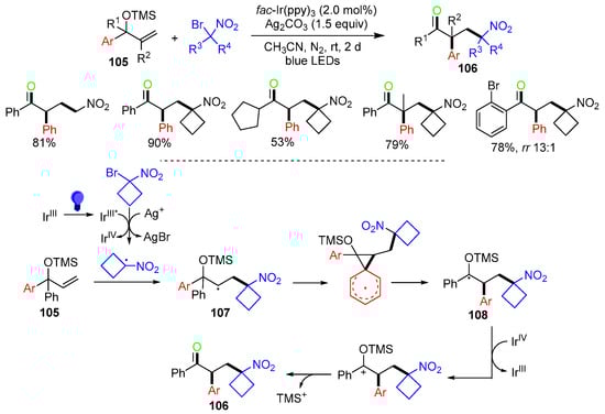 A photoredox reaction of α-aryl allyl alcohol TMS ethers 105 with gem-bromonitroalkanes for the synthesis of α-aryl-γ-nitro ketones 106 was reported by the Jiao group in 2023 (Scheme 27) [64]. The reaction process involves the addition of α-nitrocyclobutyl radicals, generated from the reaction of gem-bromonitrocylcobutane with photoexcited fac-*Ir(ppy)3 and Ag+ to the C=C bond of 105, to generate radicals 107, which undergo aryl ipso-migration to give α-trimethylsilyloxy radical 108, followed by SET oxidation to give products 106 after deprotection of TMS.