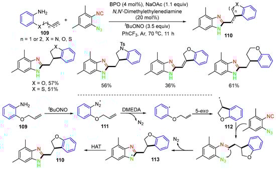 A radical reaction of alkenyl anilines 109 and 1-azido-2-isocyanoarenes involving denitrogenative radical cyclization for making 2-substituted benzoimidazoles 110 was reported by the group in 2017 (Scheme 28) [65]. The reaction process involves the generation of azidal radicals 111, releasing nitrogen gas, followed by radical cyclization to form radicals 112. Radicals 112 add to 1-azido-2-isocyano-3,5-dimethylbenzene, followed by denitrogenative cyclization to form benzoimidazole radicals 113, and then products 110 after HAT.