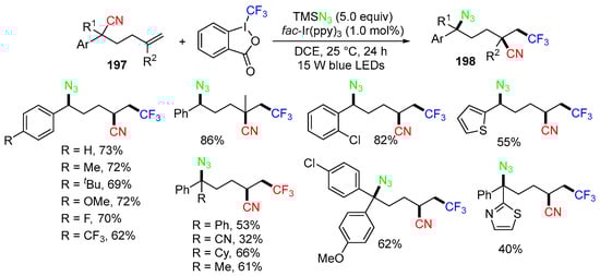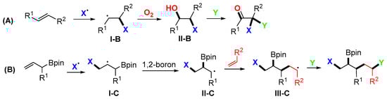 Highly reactive synthetic radicals are feasible in making carbon–carbon and carbon–heteroatom bonds via a broad scope of transformations, including addition, cyclization, coupling, rearrangement, fragmentation, atom or group transfer, and single electron oxidation/reduction reactions [1,2]. Cascade radical transformations have intrinsic power in the construction of diverse molecular scaffolds and for incorporating multiple functional groups into the products. In addition to traditional methods for conducting radical reactions [3,4,5,6,7,8,9], recent developments in photoredox reactions [10,11,12,13], electrochemical reactions [14,15], and mechanoredox reactions [16] have paved new ways for synthetic radicals. From reaction efficiency, product diversity, and green chemistry considerations, cascade reactions and difunctionalization have a high pot-, atom-, and step-economy [17,18,19]. There are a number of reviews on radical difunctionalization reactions [20,21,22,23,24,25,26,27,28,29,30,31], including our recent articles on 1,2-difunctionalization of alkenes and alkynes (Scheme 1I) [32], remote 1,3-, 1,4-, 1,5-, 1,6-, and 1,7-difunctionalization of alkenes and alkynes (Scheme 1II) [33], addition/cyclization sequence of dienes, enynes, and related compounds (Scheme 1III) [34], and cyclization-initiated sequence for making cyclic compounds (Scheme 1IV) [35]. This paper covers radical trifunctionalization reactions reported in the last decade, while most papers were published in the last five years.