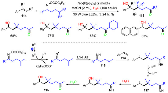 - Ma, Z.-Y.; Guo, L.-N.; Gu, Y.-R.; Chen, L.; Duan, X.-H. Iminyl radical-mediated controlled hydroxyalkylation of remote C(sp3)−H bond via tandem 1,5-HAT and difunctionalization of aryl alkenes. Adv. Synth. Catal. 2018, 360, 4341–4347. [Google Scholar] [CrossRef]