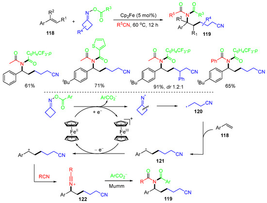 - Golagani, D.; Ajmeera, S.; Erb, W.; Mongin, F.; Akondi, S.M. Ferrocene catalyzed redox-neutral difunctionalization of alkenes using cycloketone oxime esters: Access to distal imido-nitriles. Chem. Commun. 2023, 59, 9259–9262. [Google Scholar] [CrossRef] [PubMed]