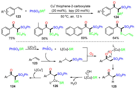 - Huang, S.; Thirupathi, N.; Tung, C.; Xu, Z. Copper-catalyzed oxidative trifunctionalization of olefins: An access to functionalized β-keto thiosulfones. J. Org. Chem. 2018, 83, 9449–9455. [Google Scholar] [CrossRef] [PubMed]