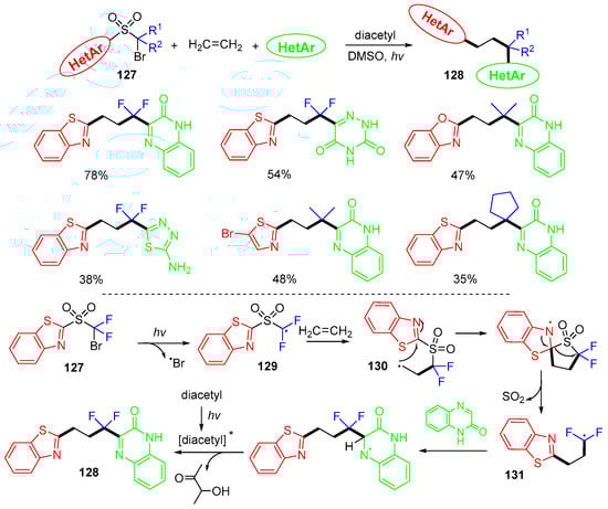- Yuan, X.; Liu, J.; Lv, H.; Qin, L.; Duan, X.; Wang, J.; Wu, M.; Chen, B.; Qiu, J.; Guo, K. Visible-light-induced selective alkylsulfonylation of unactivated alkenes via remote heteroaryl migrations. Green Synth. Catal. 2024, 5, 126–130. [Google Scholar] [CrossRef]