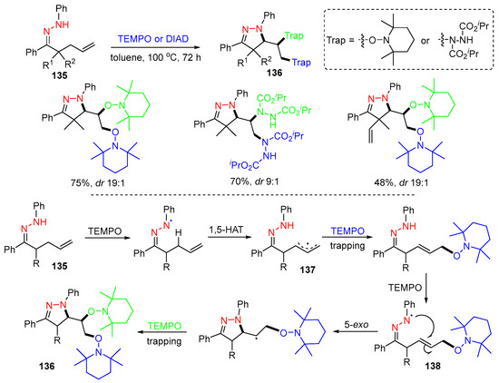 - Duan, X.; Yang, X.; Fang, R.; Peng, X.; Yu, W.; Han, B. Hydrazone radical promoted vicinal difunctionalization of alkenes and trifunctionalization of allyls: Synthesis of pyrazolines and tetrahydropyridazines. J. Org. Chem. 2013, 78, 10692–10704. [Google Scholar] [CrossRef]