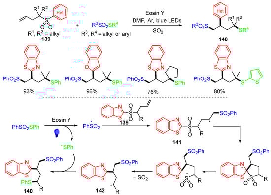 - Liu, X.; Tian, S.; Jiang, Y.; Rao, W.; Wang, S. Visible-light-triggered sulfonylation/aryl migration/desulfonylation and C–S/Se bond formation reaction: 1,2,4-trifunctionalization of butenyl benzothiazole sulfone with thiosulfonate/selenosulfonates. Org. Lett. 2021, 23, 8246–8251. [Google Scholar] [CrossRef]