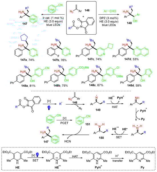 - Li, S.; Du, H.; Davies, P.W.; Shu, W. Synthesis of unprotected α-tertiary amines and 1,2-amino alcohols from vinyl azides by light induced denitrogenative alkylarylation/dialkylation. CCS Chem. 2024, 6, 1060–1070. [Google Scholar] [CrossRef]