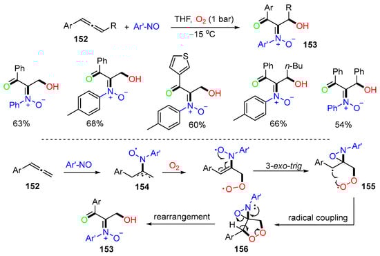 - Liu, J.; Skaria, M.; Sharma, P.; Chiang, Y.W.; Liu, R.S. Ground-state dioxygen undergoes metal-free [3 + 2]-annulations with allenes and nitrosoarenes under ambient conditions. Chem. Sci. 2017, 8, 5482–5487. [Google Scholar] [CrossRef] [PubMed]