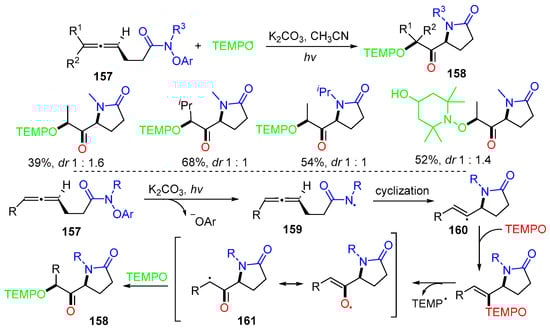 - Ward, R.M.; Schomaker, J.M. Allene trifunctionalization via amidyl radical cyclization and TEMPO trapping. J. Org. Chem. 2021, 86, 8891–8899. [Google Scholar] [CrossRef]
